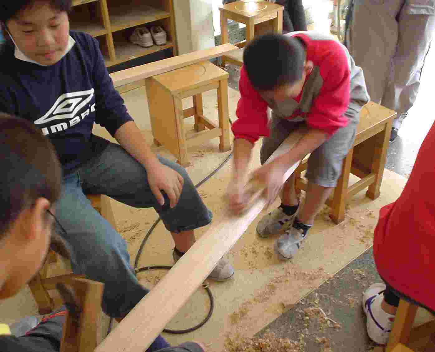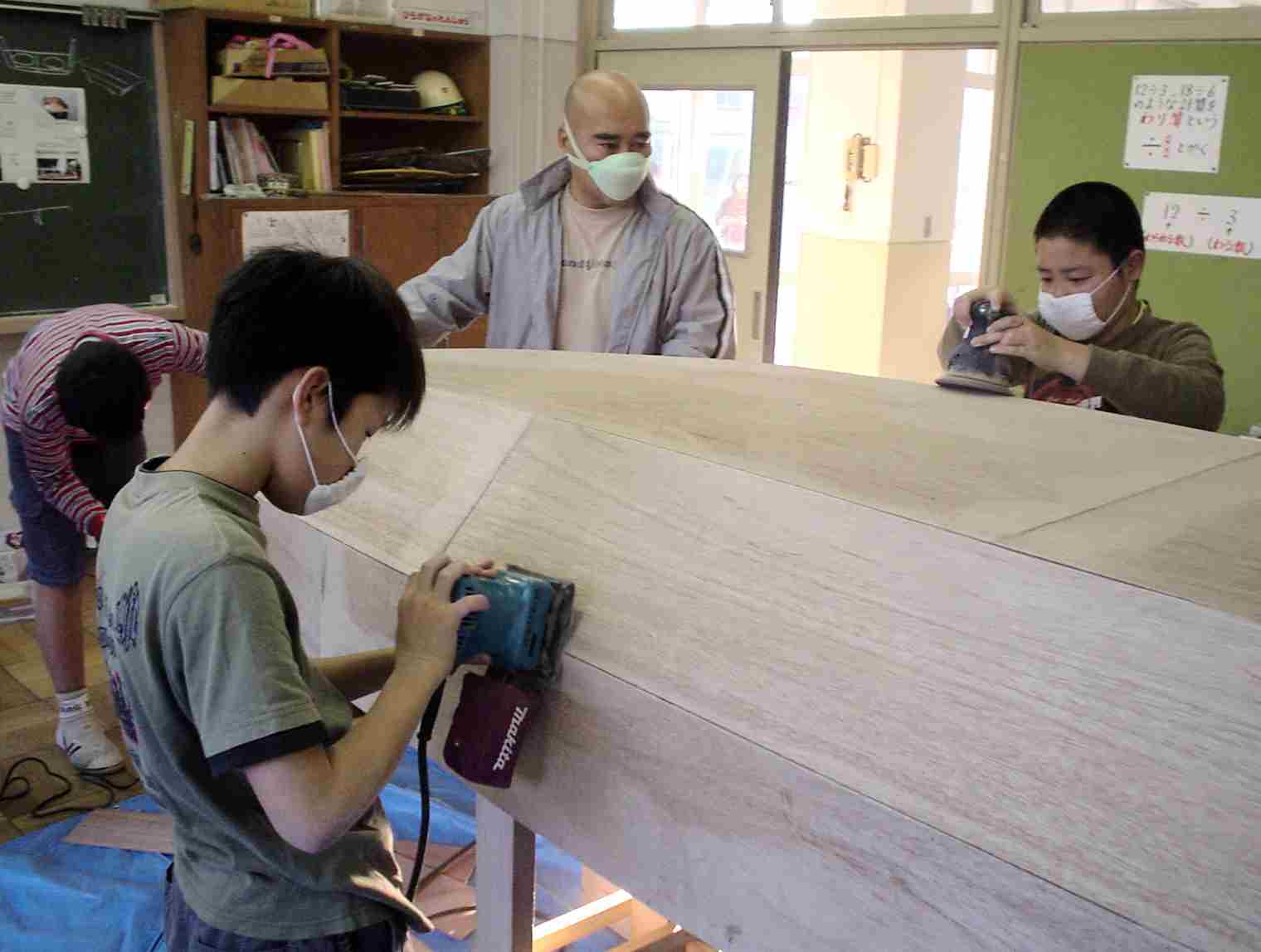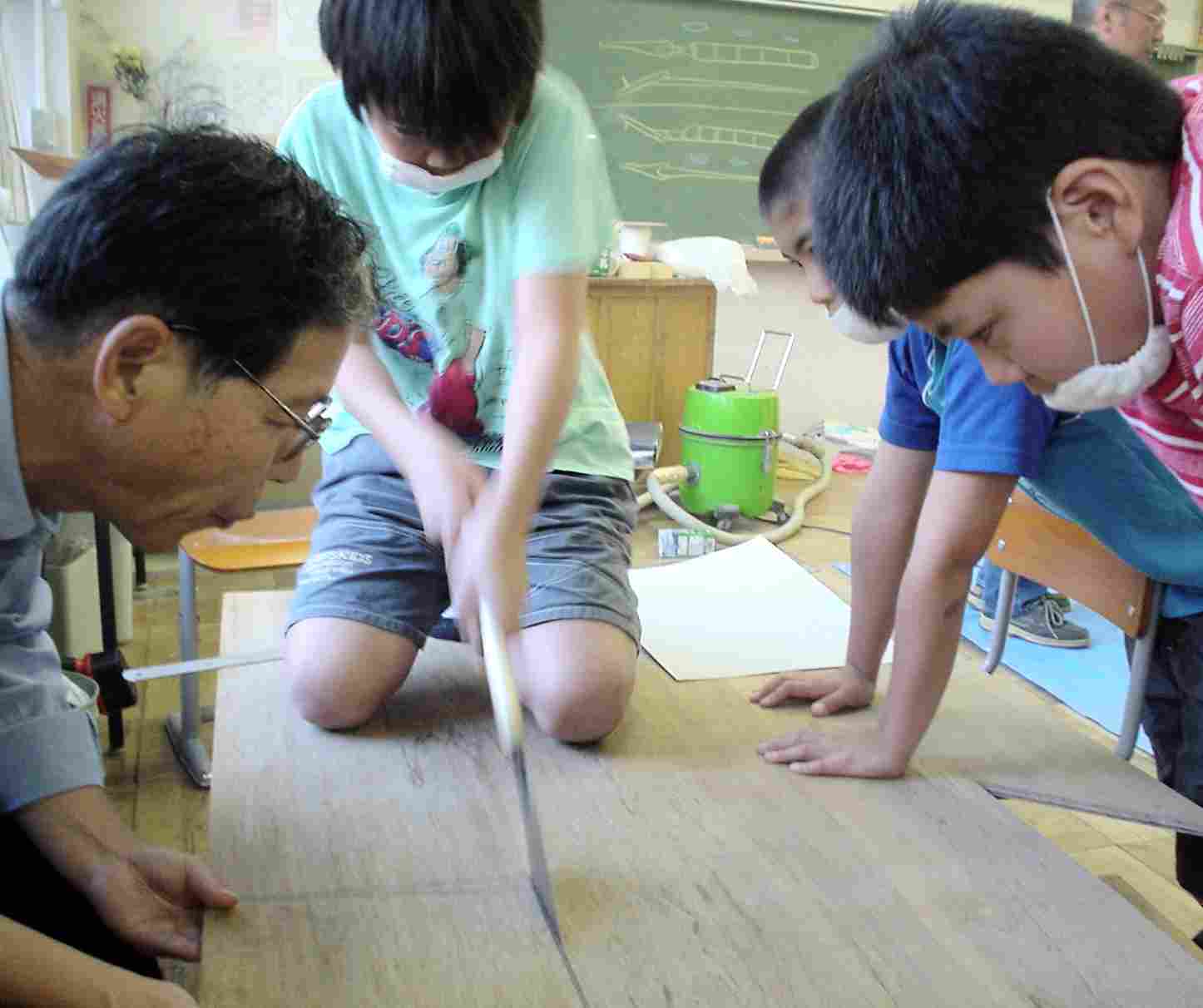 のこぎりの使い方を習いながら、座席の板を切り出している