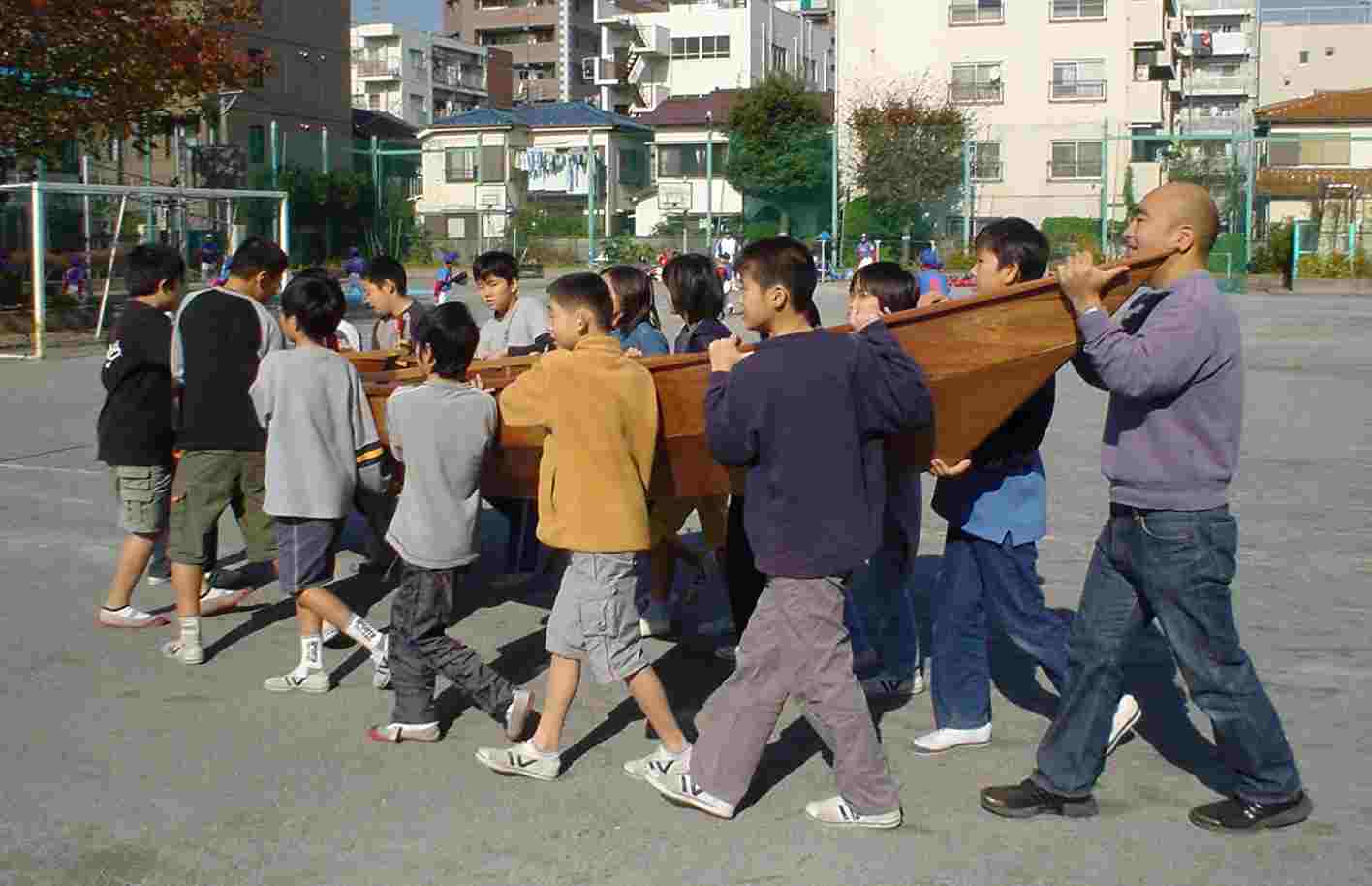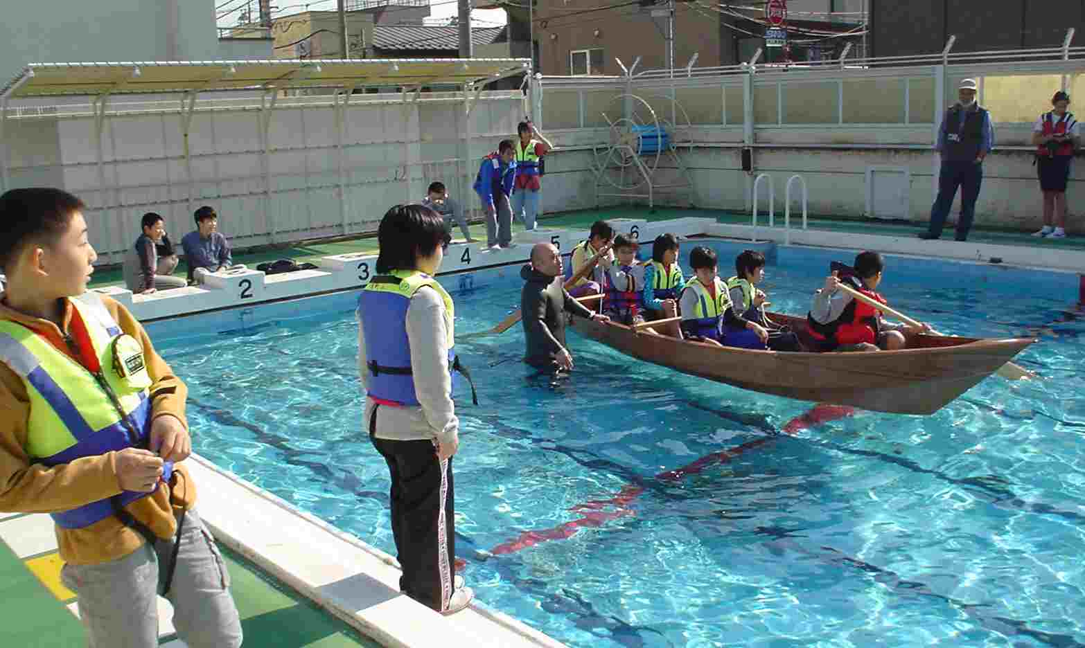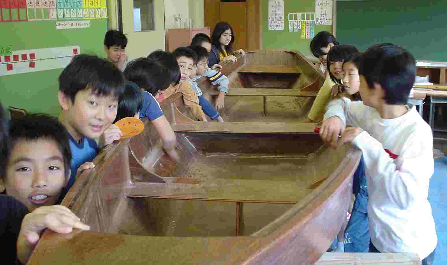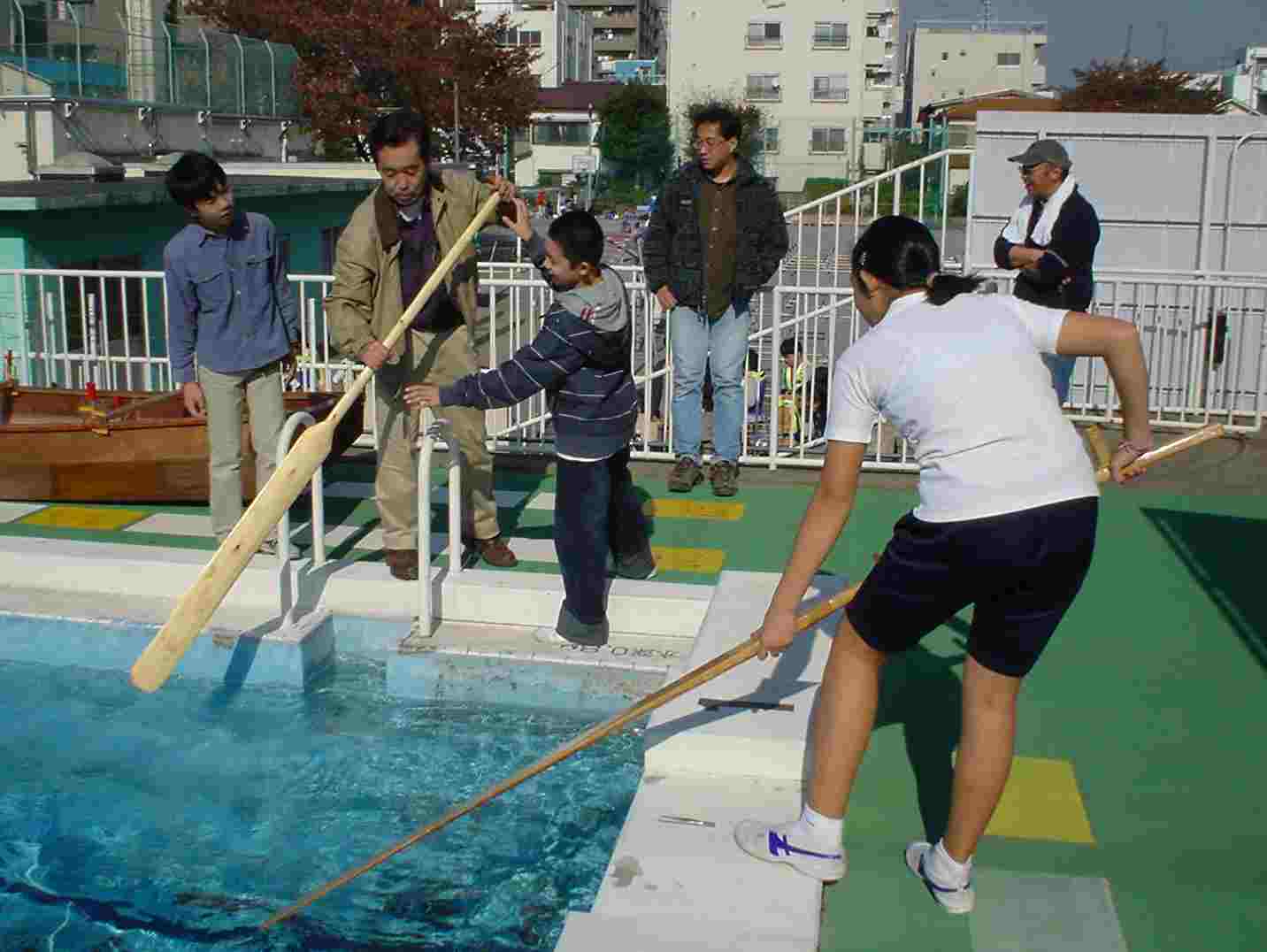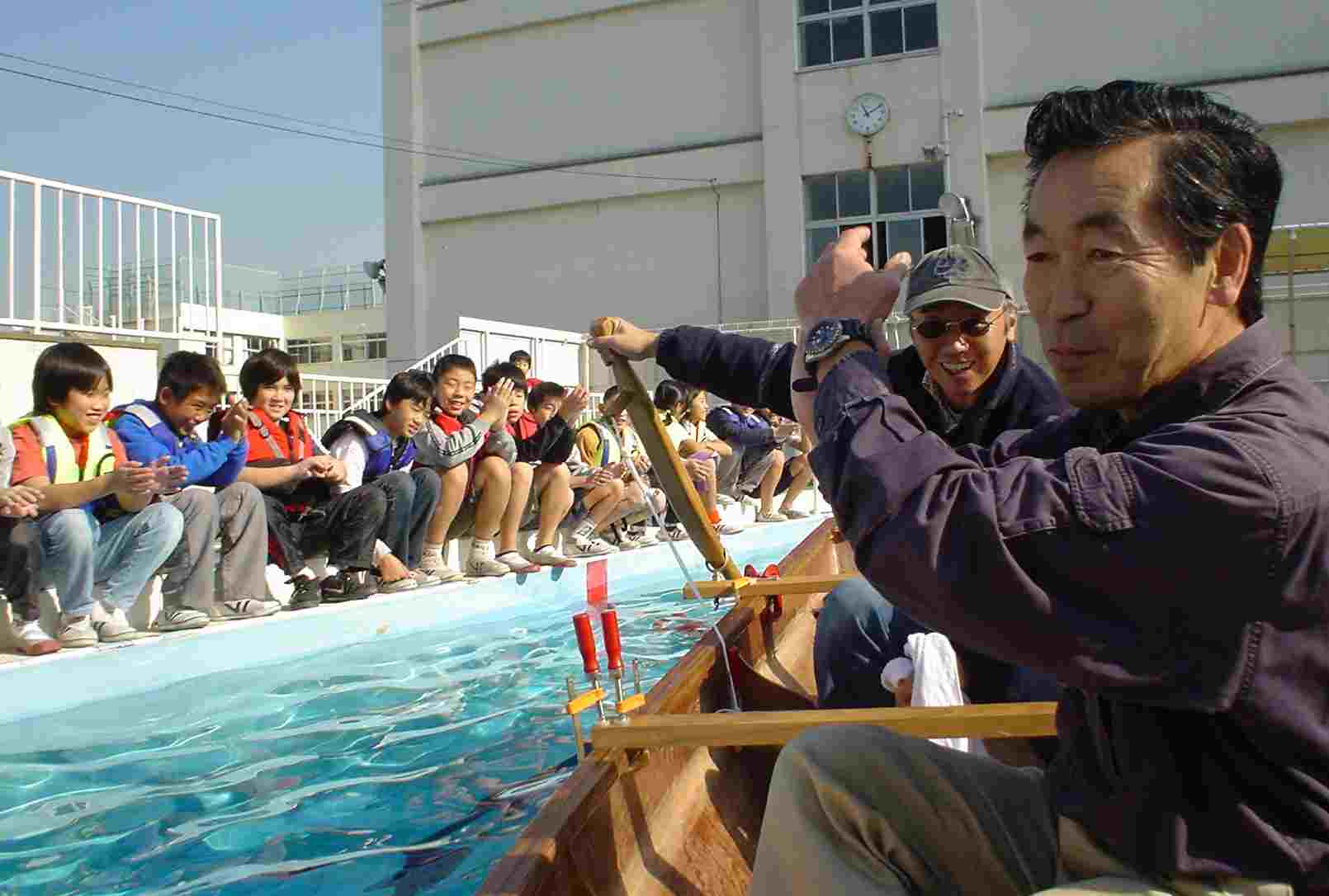 櫂を持って指導しているのは新型櫓を開発した土井さん